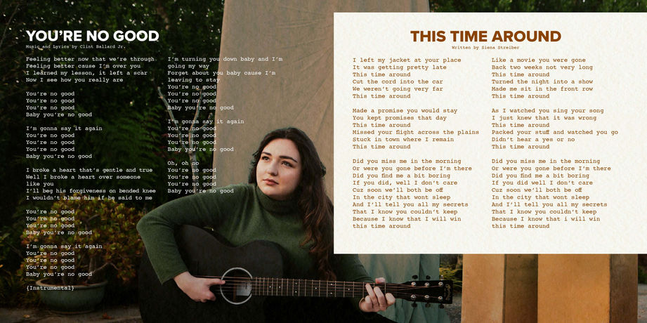 Siena draws inspiration from the singer-songwriters she grew up listening to-- Joni Mitchell, Taylor Swift, Norah Jones, Stevie Nicks, Carol King, Adele, and more. Her debut album SIENA features a more folksy, acoustic vibe and is made up of a catalog of work written mostly in Siena's youth. Her sophomore EP, HINDSIGHT, was released July 12th, 2024 and was produced by Justin Glasco. The EP features the singles "LOST IN YOU" (Feat. David Ryan Harris) and "ALRIGHT WITH YOU".